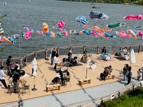 市民の憩いの場である千波湖親水デッキにドラムセットを6台並べ、誰でも自由にドラムを叩けるというイベントです。普段、音楽スタジオに行かないとなかなか触れることができないドラムセットを多世代の方に触れてもらい、実際に叩いて打楽器の楽しさを体験してもらいたいと思いドラマー仲間で運営しています。 | |